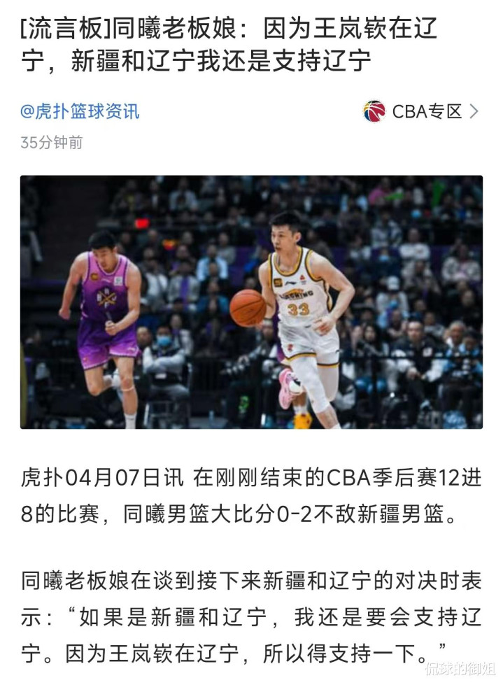 让人没想到的是,南京刚被对手横扫出局,同曦的网红老板娘再次语出惊人,直言因为自己的租借球员王岚嵚在辽宁,所以支持辽宁队淘汰新疆,这等于变向帮南京队复仇吗?本赛季的季后赛,南京老板娘确实网上热度很高,此前声称想挑广东打,后来又说黑掉新疆晋级八强,最后又变成了支持辽宁。